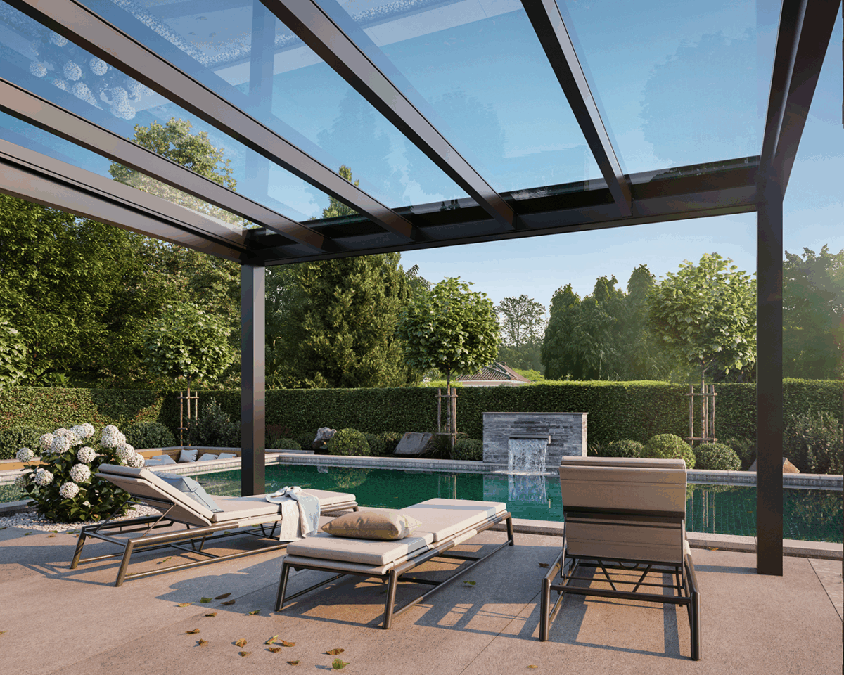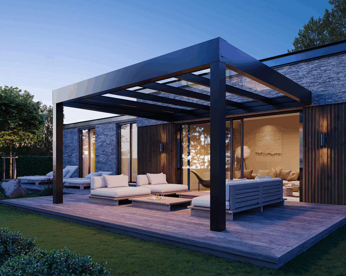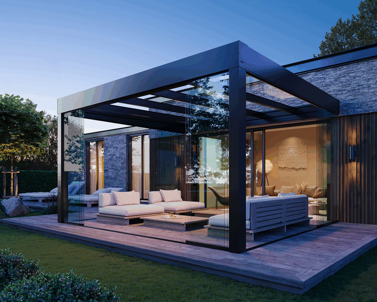 CUBO-EZIE är utvecklat för att ge dig maximal frihet – både i uttryck och användning. Det kan byggas som fristående tak, integreras mot fasad eller kompletteras med glaspartier för extra skydd mot vind och regn.